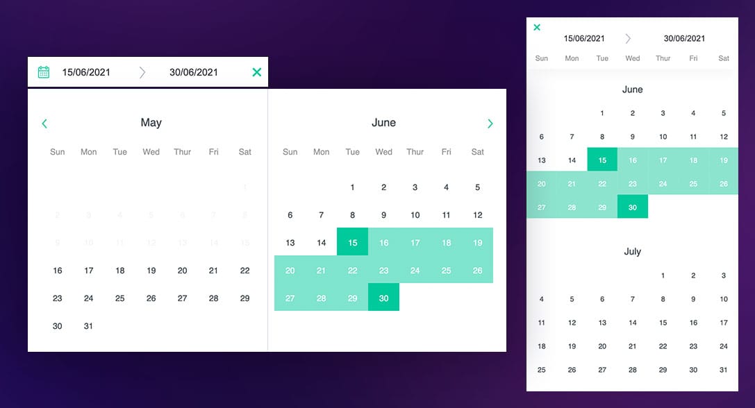 A responsive date range picker that allows custom check-in/check-out rules, localisation support and more.